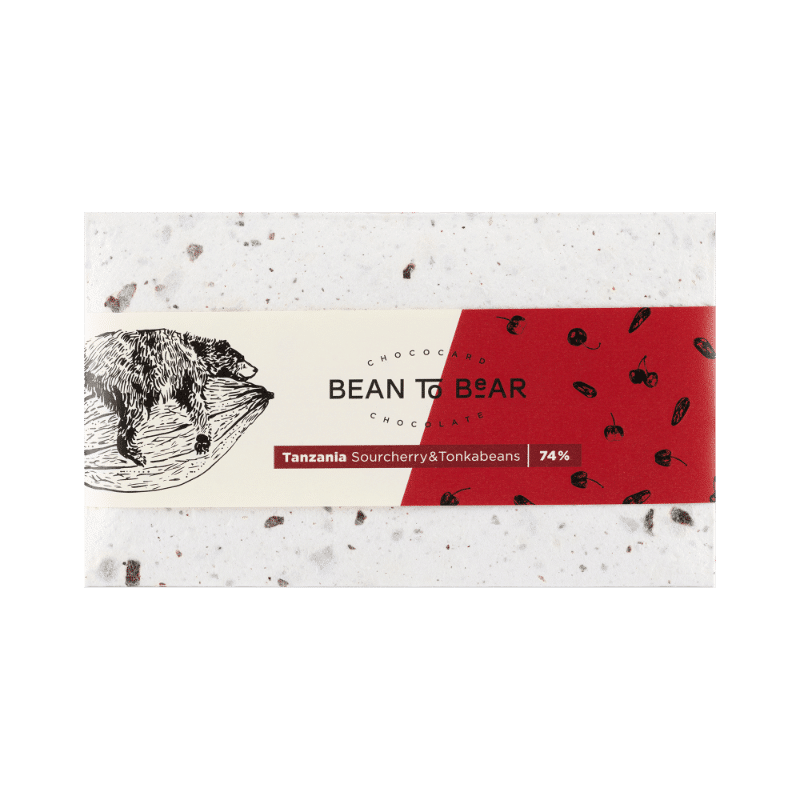 Bean-to-Bear csokoládé, meggy porral és tonkababbal ízesítve, tanzán kakaóbabból.