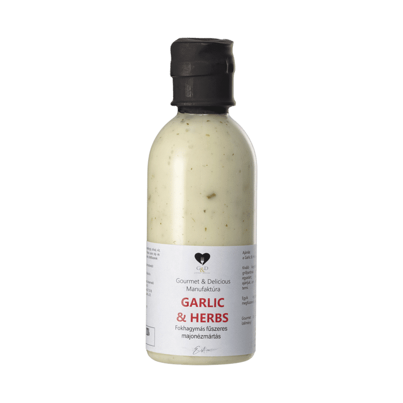 Zöldfűszeres-fokhagymás szósz. Tej és tojásmentes.Felbontás után hűtőben tartandó!